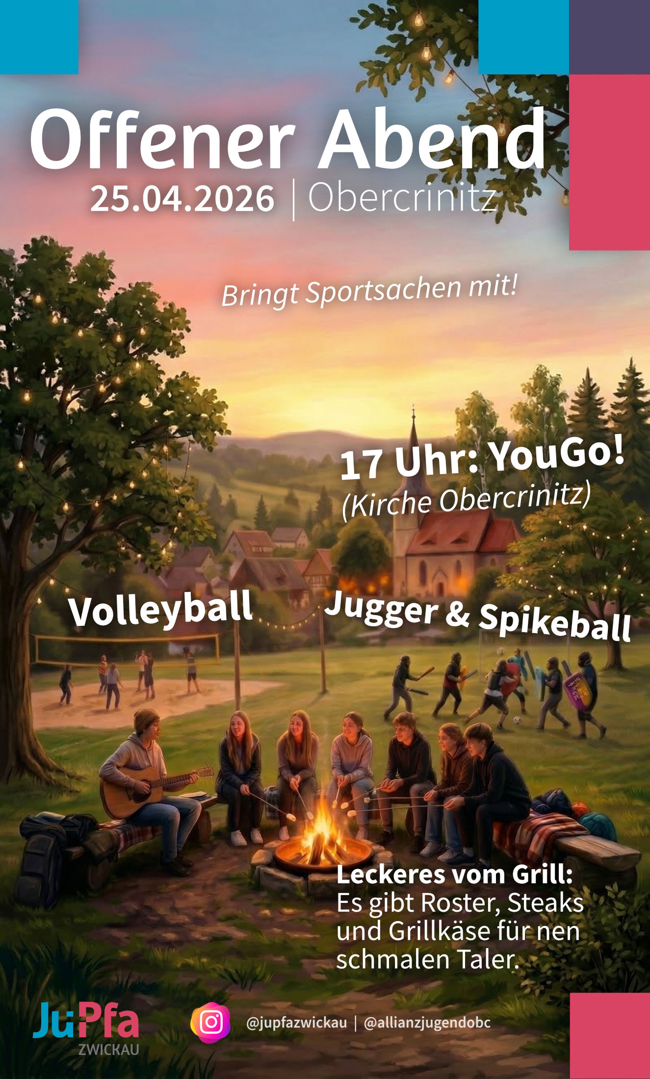 „JuPfa Zwickau steht für Jugend, Glaubensförderung und Gemeinschaft. Unser Ziel ist es, junge Menschen in Zwickau auf ihrem Weg im Glauben zu unterstützen und ihnen Raum für persönliche geistliche Entwicklung sowie aktive soziale Teilhabe zu bieten. Wir sind überzeugt, dass jeder Jugendliche von Gott begabte Fähigkeiten besitzt und dazu berufen ist, diese Welt ein kleines Stück weit zu verändern – und wir möchten ihnen helfen, dieses Potenzial im Einklang mit ihrem Glauben zu entfalten.“